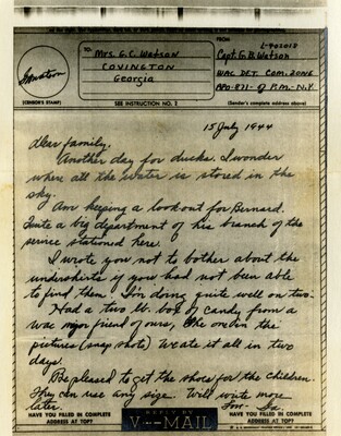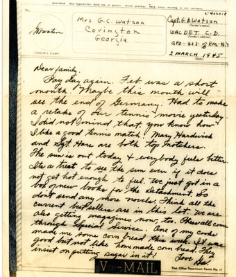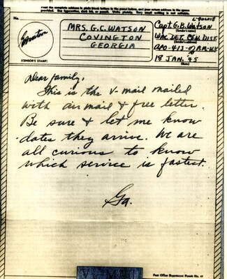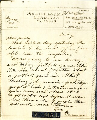 Selections of letters from the Georgia B. Watson papers were digitized by undergraduate intern Jaylee Kilgo (Georgia Southern). Metadata was contributed by undergraduate volunteer Anne W. O'Neill (Georgia College), 2025. Transcriptions are being prepared by students in HIST 3030 – Women & War, under the guidance of Drs. A. Belzer and F. Turner. Transcriptions are expected to be available in 2026.