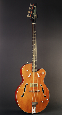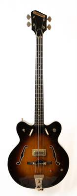 "Solid asymmetrical double cutaway, and unique body shape with beveled edges, 2 chrome Super'Tron pickups, 3 knobs, 3 switches, roller bridge and Burns vibrato, Neo-Classic inlay,4 tuners on the bass side of headstock 2 on the treble side. With original case."