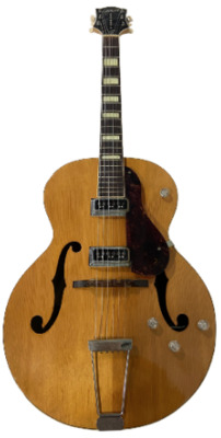 "Spruce top, maple back and sides, Pearl-inlaid headstock, hand engraved bakelite ivory celluloid bound pickguard. Small f holes, block inlays. All original gold tail piece and tuners. With original case."