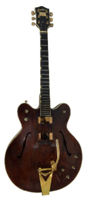 "16" wide cutaway body G brand with 3 chrome DeArmond pickups, 3 'G/arrow' knobs on lower treble bout, one on upper bout, chrome Melita bridge, Bigsby converted Vibrato, bound rosewood fingerboard with block etched cows & cactus inlays, headstock with Gretsch 'T' roof logo and longhorn, replaced gold tuners. with original white Gretsch case. This guitar has a hole in the back for electronics access. An extra DeArmond pickup was added to the guitar. Schaller were added. Good player guitar."