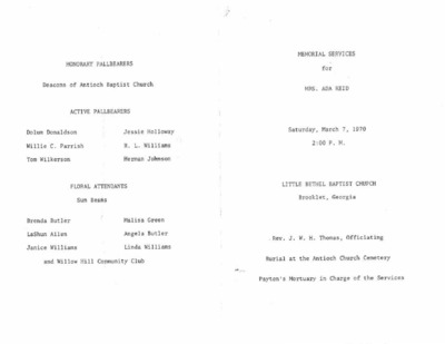 The documents included in this database are mainly in the form of funeral programs of African Americans who lived in or had ties to Bulloch County, Portal, Statesboro, or surrounding areas. Some contain very basic information, providing only the deceased name, date of birth, and place of internment, while others offer rich detail into a person’s life and include photographs. The Willow Hill Heritage & Renaissance Center hopes this collection will provide not only a personal history of the individuals, but also a collective history of African Americans in and from Bulloch and surrounding counties.