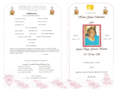 The documents included in this database are mainly in the form of funeral programs of African Americans who lived in or had ties to Bulloch County, Portal, Statesboro, or surrounding areas. Some contain very basic information, providing only the deceased name, date of birth, and place of internment, while others offer rich detail into a person’s life and include photographs. The Willow Hill Heritage & Renaissance Center hopes this collection will provide not only a personal history of the individuals, but also a collective history of African Americans in and from Bulloch and surrounding counties.