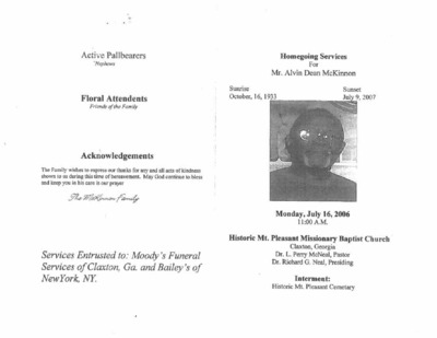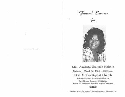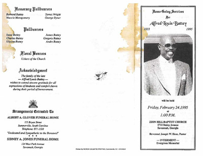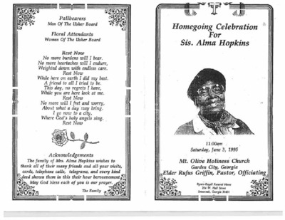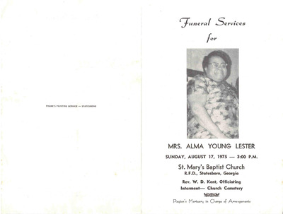The documents included in this database are mainly in the form of funeral programs of African Americans who lived in or had ties to Bulloch County, Portal, Statesboro, or surrounding areas. Some contain very basic information, providing only the deceased name, date of birth, and place of internment, while others offer rich detail into a person’s life and include photographs. The Willow Hill Heritage and Renaissance Center hopes this collection will provide not only a personal history of the individuals, but also a collective history of African Americans in and from Bulloch and surrounding counties.