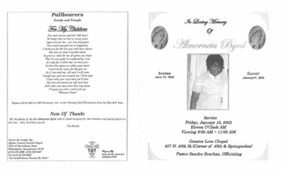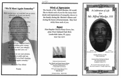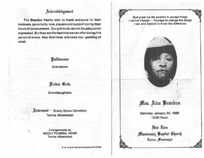 Obituaries, funeral programs, and death certificates relay more than a notice of a person’s passing. They include valuable information that may be difficult to find otherwise, such as where the individual worked, where they attended church, what organizations they were a part of, their education, and names of family members. These brief, personal histories help family and friends learn details of the life of the deceased. Examining a large collection of obituaries can also provide information about large trends within a community and insight into a particular time period, making them important not only to genealogical research, but to local history as well. Obituaries are reflections of the time period in which they were written. The obituaries of African Americans were not typically published in local newspapers until the 1960s, coinciding with the nationwide effort to desegregate. Before then, family members handwrote the deceased’s history, keeping their life stories and accomplishments known only to loved ones. When blacks and whites began to integrate, however, articles pertaining to African Americans, such as coverage of sporting events, school activates, and even obituaries were included in local newspapers and communicated to the wider public, spreading their personal histories to larger audiences. The documents presented in this online collection contribute to the public’s understanding of local African American history by offering a glimpse into popular hymns, Bible passages, and the rhetoric of the community.